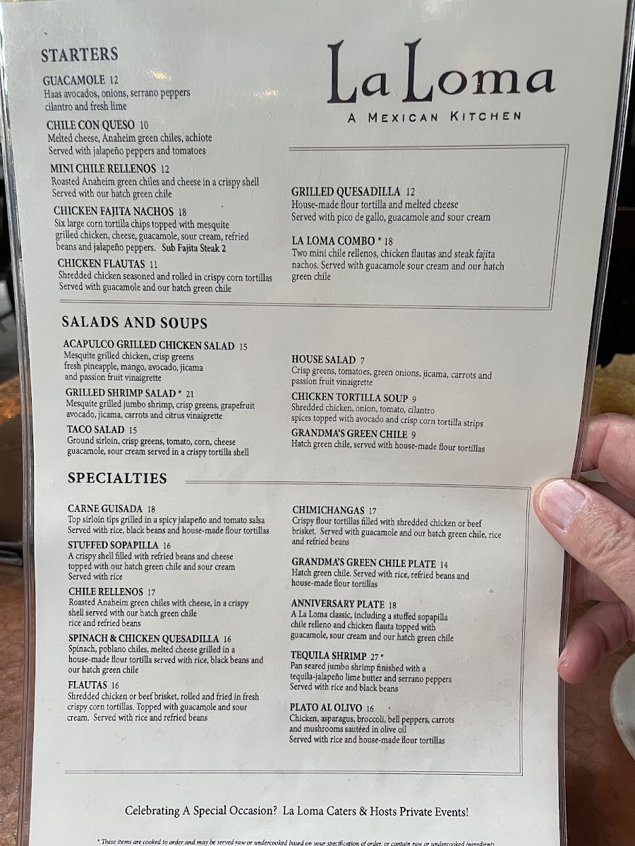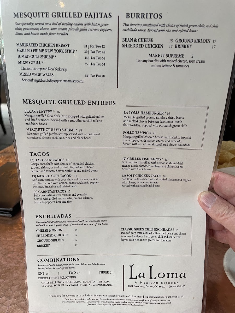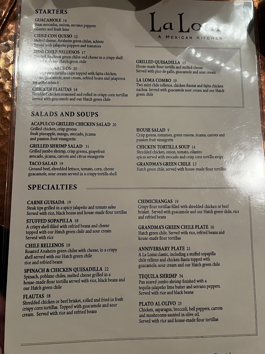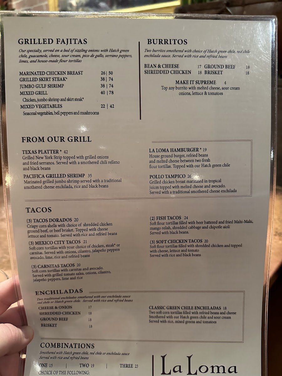 You can just never go wrong with the fajitas from La Loma! My absolute favorite. I always get green chile on the side. The service is excellent and friendly... and there’s always leftovers to take home for at least least two meals!